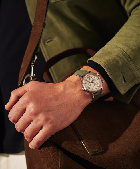 La pulsera de material compuesto verde caqui con motivo textil incorpora un cierre de hebilla de pasador doble en oro blanco, inspirado en las correas utilizadas por los aviadores para sujetar su equipo de emergencia, aportando un toque de elegancia urbana e informal. El nuevo Calatrava Pilot Travel Time, referencia 5524G -010, sustituye en la colección a la referencia 5524G-001 en oro blanco y se une a la referencia 5524R-001 en oro rosa, reafirmando la fusión entre tradición aeronáutica y refinamiento contemporáneo característica de Patek Philippe.