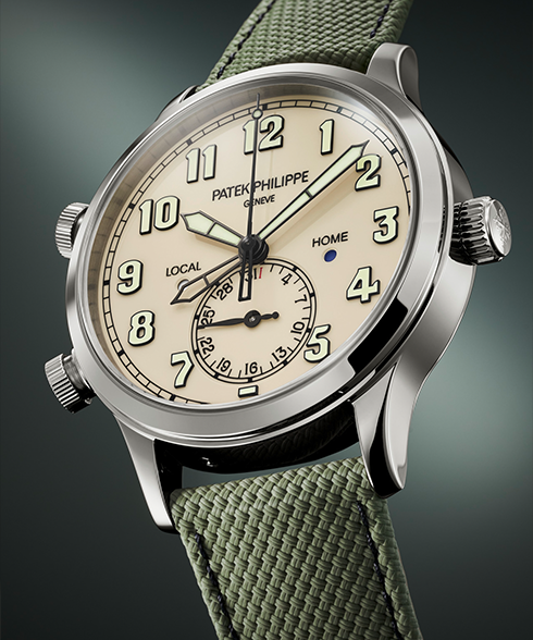 Patek Philippe reinterpreta la versión de oro blanco dotándola de una elegante esfera lacada color marfil, que refuerza su carácter contemporáneo. La legibilidad de esta esfera de inspiración aeronáutica se optimiza mediante cifras aplicadas ennegrecidas de oro blanco, caladas y realzadas con revestimiento luminiscente, así como por las grandes agujas tipo espada, también visibles en la oscuridad.