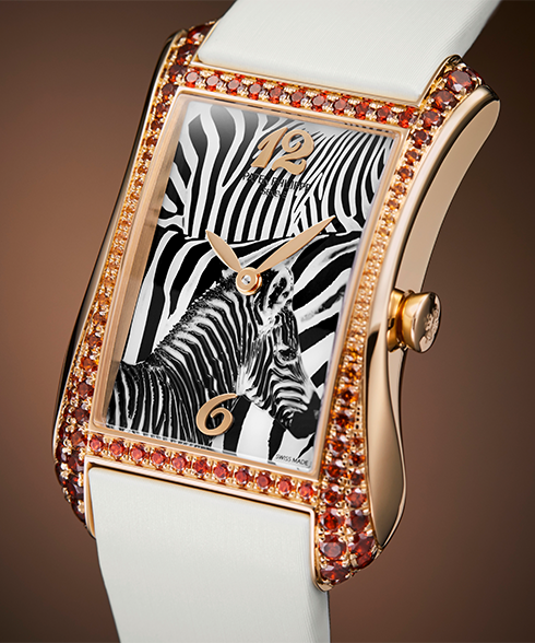 Patek Philippe reinterpreta este modelo con una esfera con el original motivo de cebra, inspirada en el reloj de pulsera Golden Ellipse referencia 5738/50G-023, realizado en esmalte cloisonné y presentado como una de las piezas destacadas de la colección Alta Artesanía 2022. Para recrear el juego visual de las rayas con la cebra en primer plano, la manufactura ginebrina ha aplicado una técnica innovadora y refinada en una esfera de cristal de zafiro grabada y entintada por ambas caras con lo que se consigue magníficos efectos de volumen y profundidad. La hora se indica mediante dos cifras Breguet aplicadas, a las 12 y a las 6 horas, y agujas de oro rosa en forma de hoja.